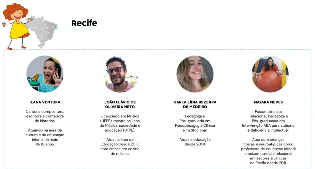 Em Catalão (GO), as CMEIs atendidas são: Lázaro Pinto Marra, Ana Maria C. Macedo Montenegro e Henriqueta Purcina de Oliveira, totalizando 463 crianças atendidas conjuntamente. Em Recife (PE), será atendido o Espaço Criar, um centro de referência no atendimento à primeira infância, que anualmente atende, em média, 2.000 crianças da rede pública municipal.