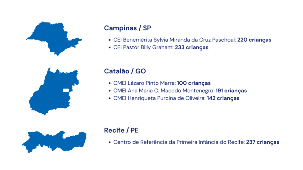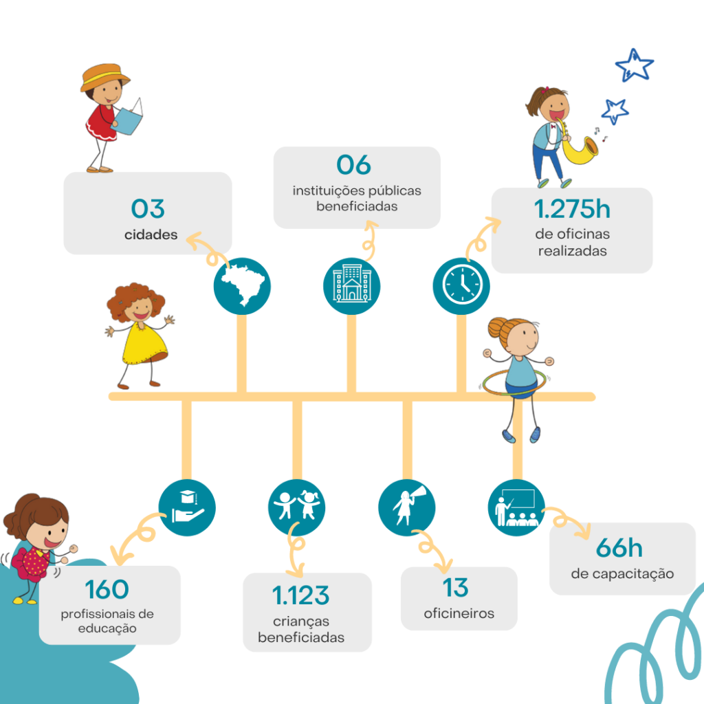 As oficinas estão sendo realizadas em 6 instituições públicas. No total são 1.123 crianças atendidas, sendo 453 crianças em Campinas, 433 crianças em Catalão e 237 crianças em Recife.